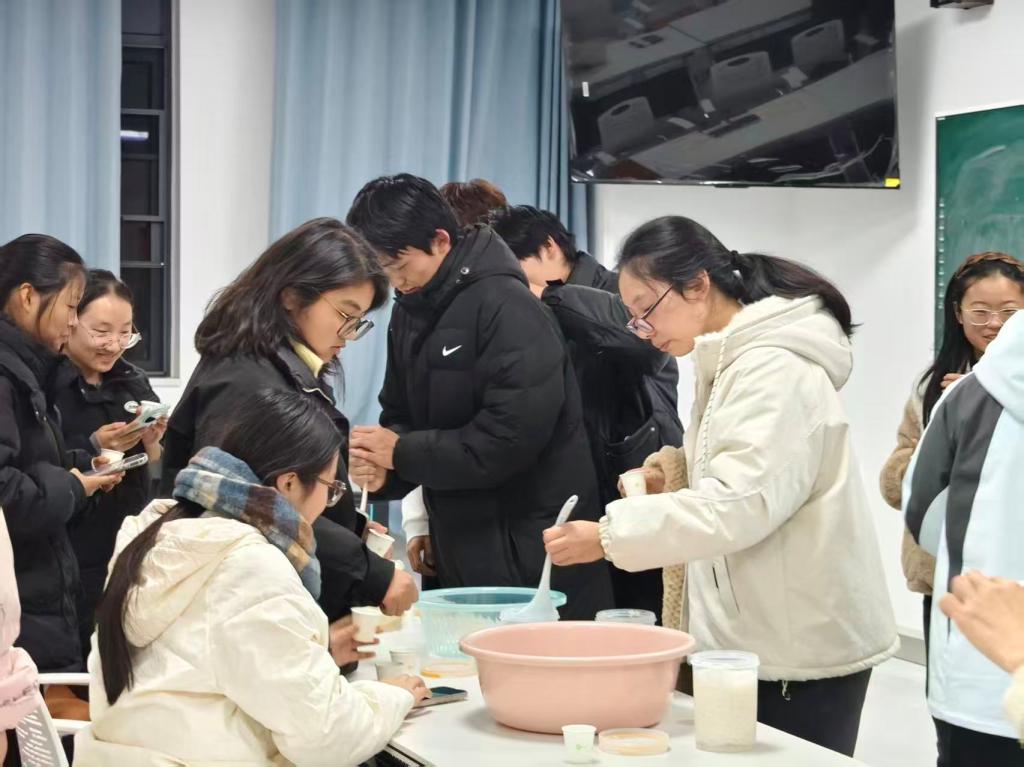 从文献查阅、试验设计、实施试验、过程观察、结果记录、数据分析、实践总结到成果汇报展示等各个环节,工作坊的同学们分组协作,展开工作。在试验中,糯米经过淘洗、浸泡和蒸煮后变得晶莹清香,冷凉后的熟糯米分别与含有不同浓度酒曲的水和红枣水相遇,在30摄氏度的环境下进行着生命体的繁衍和物质的转化。隔日后,同学们对发酵结束的成果进行指标测试和感官品鉴,并在db真人体育官网敏思楼A1-204教室,各组长以PPT形式对本小组的实践成果向师生们进行了汇报分享。最后,赵昕梅老师对本次实践活动进行了点评总结。本次活动,得到了同学们的积极认可。同学们纷纷表示,这样的活动不仅有趣,而且从中锻炼了动手能力和解决问题的能力,并对生物科学专业的学科素养有了进一步的理解和认知。