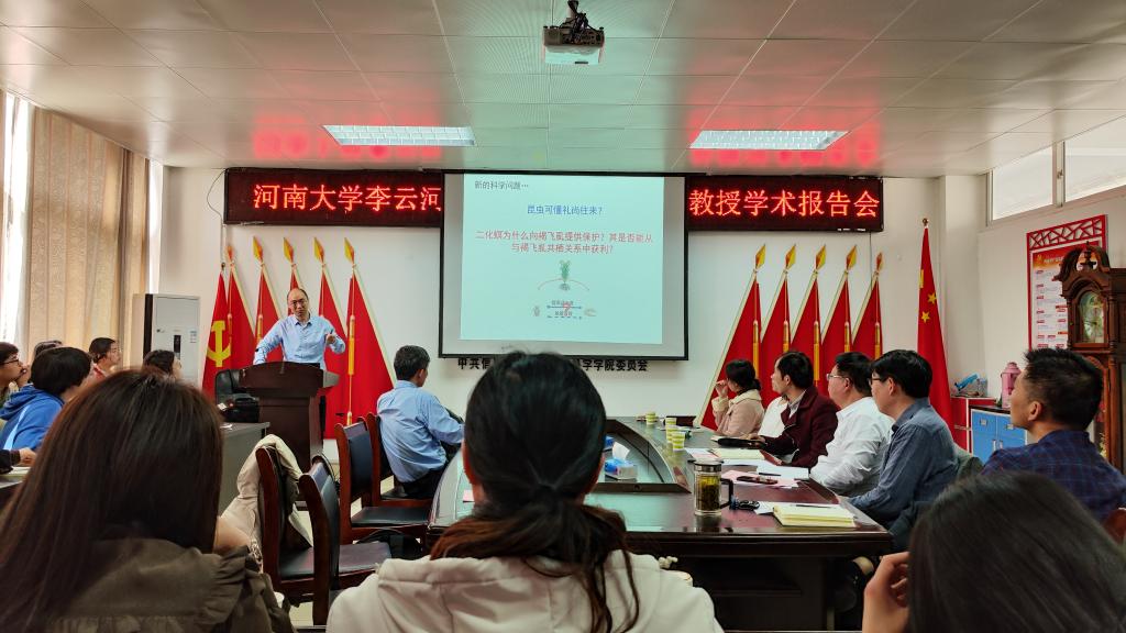 2023年3月9日上午,应db真人体育官网邀请,河南大学周树堂教授和李云河教授在生物楼412会议室,分别做了题为“昆虫高生殖力的遗传基础与分子调控机制解析”和“二化螟与褐飞虱协作应对水稻抗虫防御的生态和分子机制”的学术报告,公司青年教师及部分员工聆听了报告。报告会由经理饶本强教授主持。