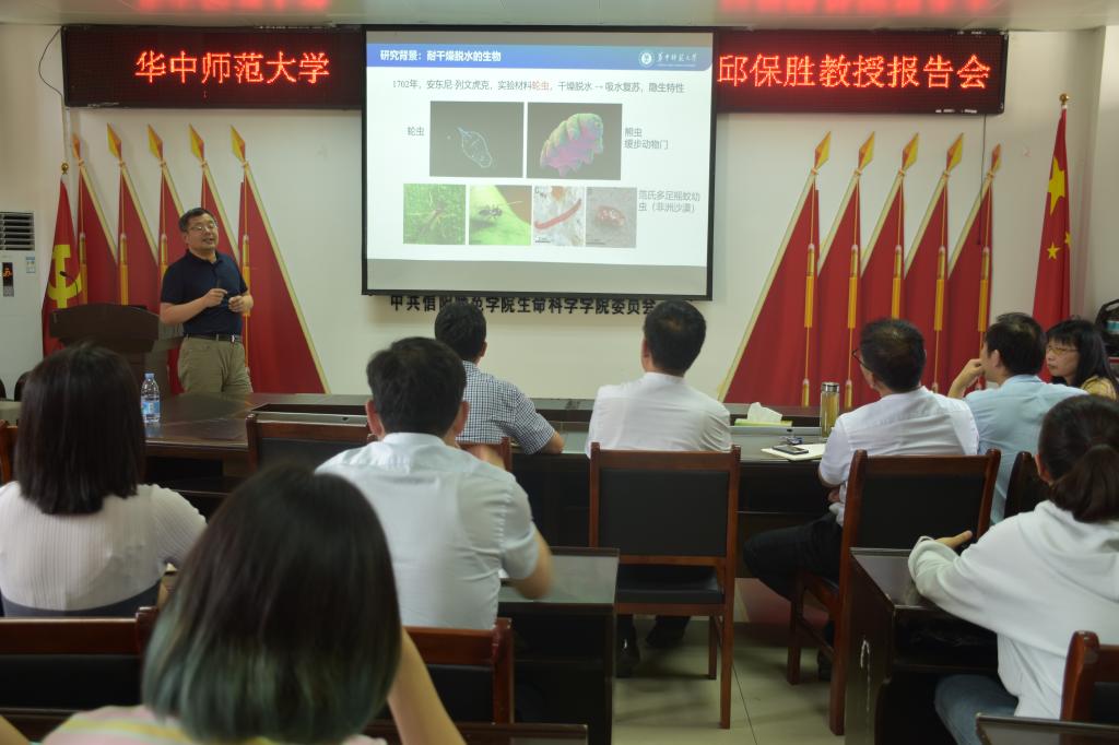 5月14日,应db真人体育官网邀请,华中师范老员工命科学公司经理邱保胜教授在生物楼412会议室做了一场题为“荒漠蓝藻光合作用的耐干燥脱水机制”的学术报告。报告会由经理饶本强教授主持,部分青年教师及研究生聆听了报告。
