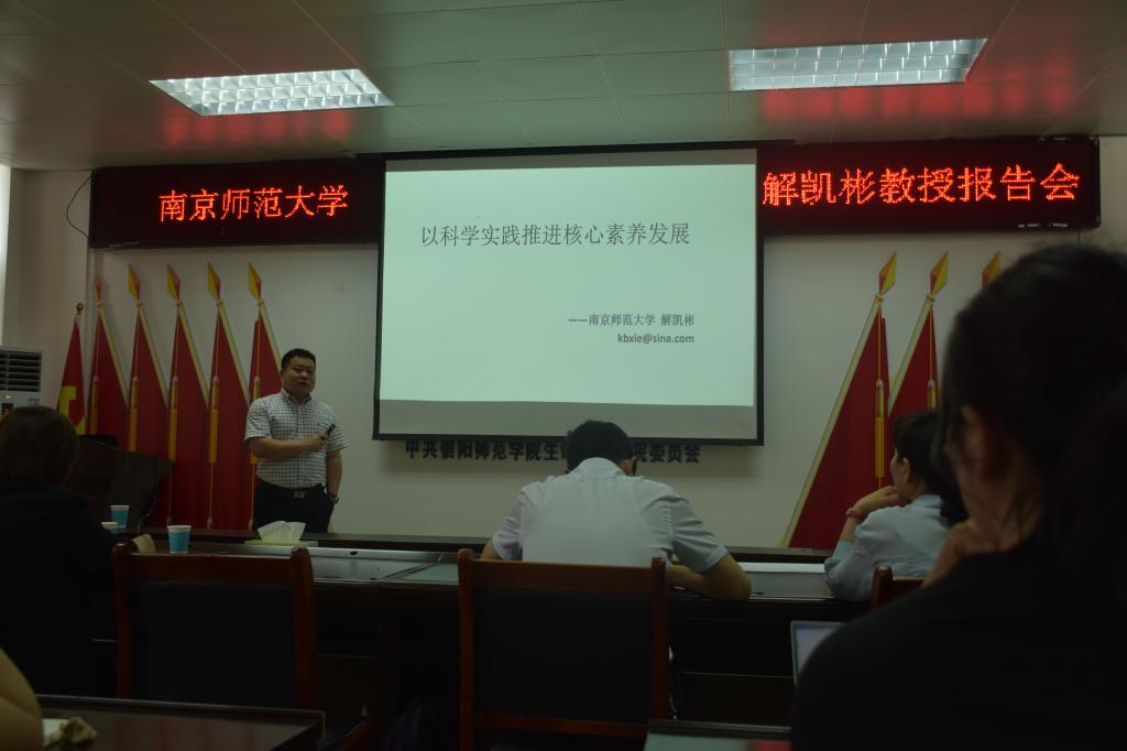 5月18日,应db真人体育官网邀请,南京师范大学教师教育公司副经理解凯彬教授在生物楼412会议室做了一场题为“以科学实践推动核心素养发展”的学术报告。教务处韩艳婷副处长、db真人体育官网荆胜利副经理和学科教学方向的教师及学科教学(生物)专业研究生聆听了报告。