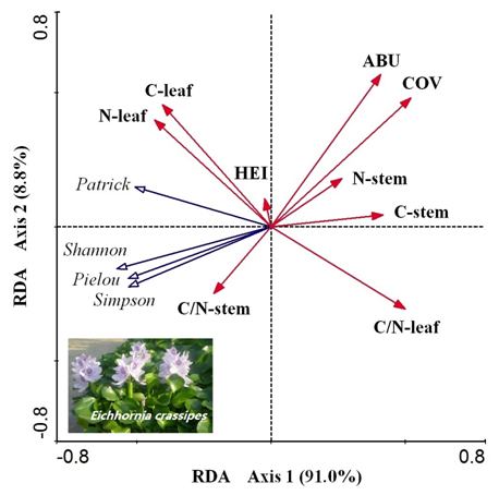 附图:凤眼莲形态特征及其生态化学计量比与本土植物多样性的RDA排序图