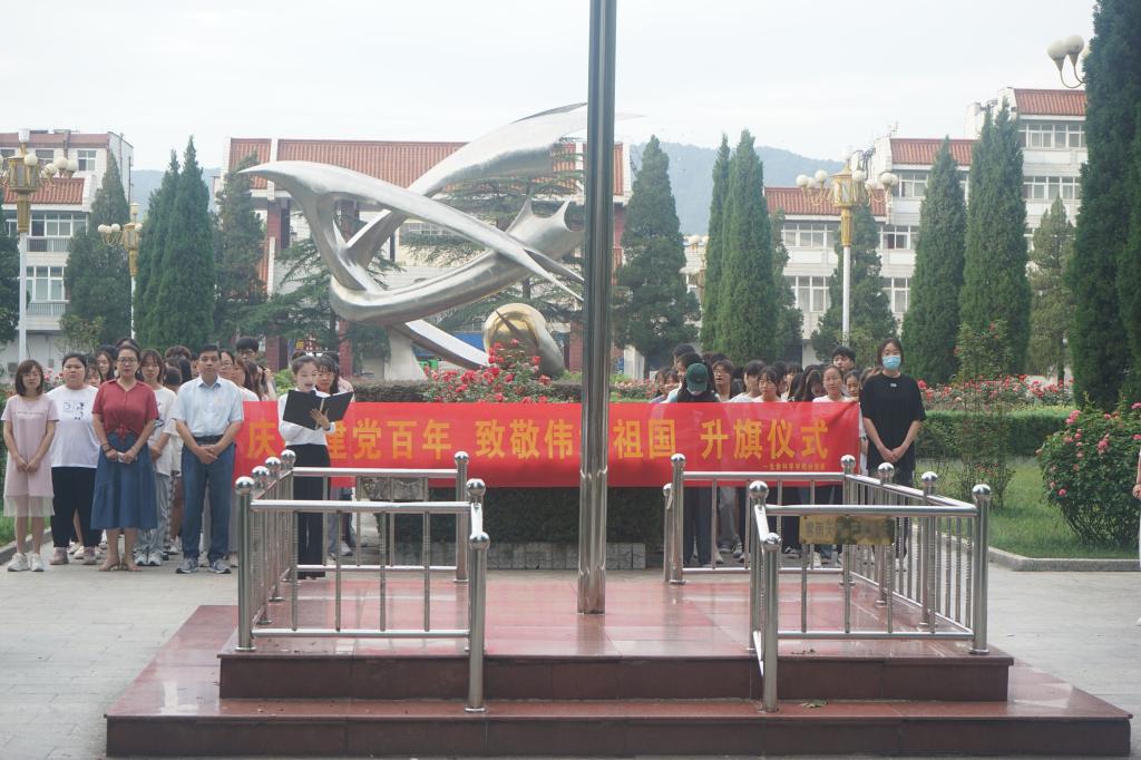 在全体师生的注目下,国旗护卫队队员护送五星红旗进场,伴随着庄严的《中华人民共和国国歌》,五星红旗冉冉升起,随风飘扬。在场师生敬礼仰注,深怀对祖国真挚的热爱与崇高的敬意。随后,杨霁虹在讲话中指出五星红旗的象征意义及爱国的表现形式,同时鼓励学子们立足岗位、努力学习,争做社会主义的接班人。2020级生物技术班叶丽娜代表员工发言,表达出对中国共产党的崇高敬意, 她也呼吁学子们爱国爱党、牢记初心、不忘使命,共同谱写新世纪社会主义事业建设的新篇章。